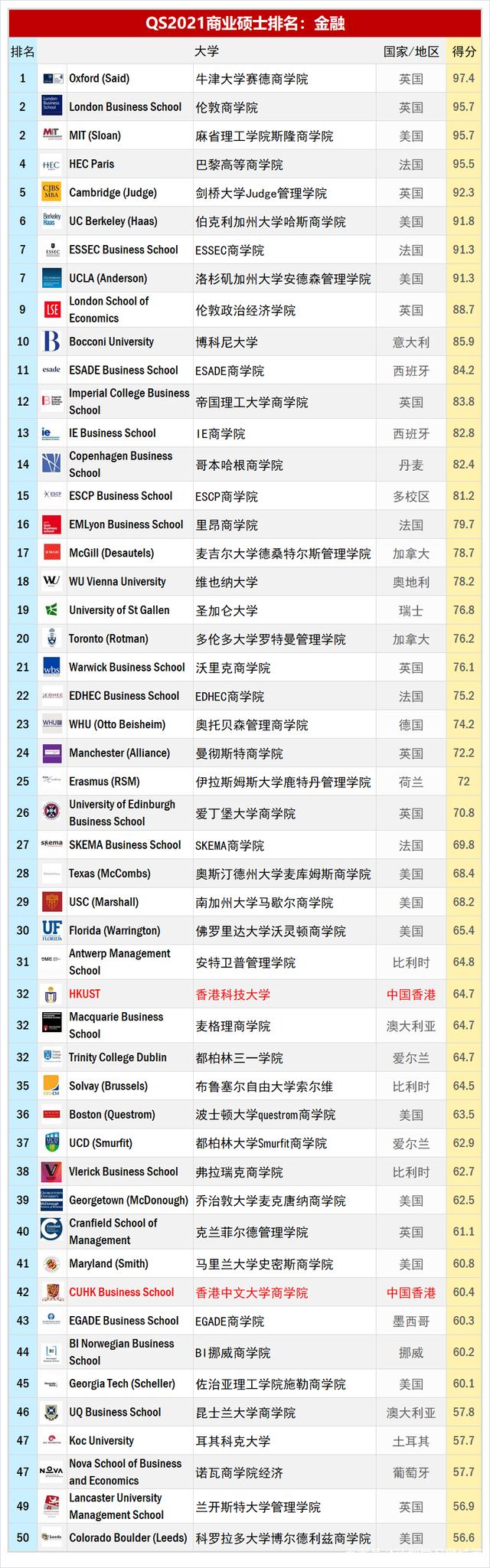 2020年9月23日,全球高等教育和商科教育研究机构QS Quacquarelli Symonds发布了2021QS商科硕士排名,该排名总共包括了商业分析硕士、金融硕士、管理硕士、市场营销硕士,和供应链管理硕士这五大商科专业。