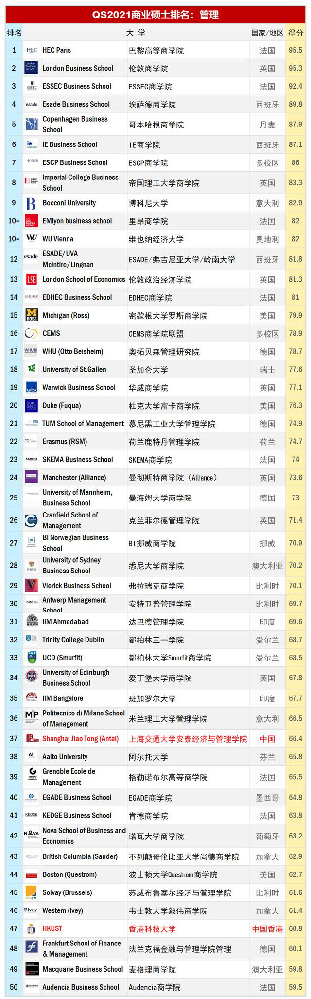 2020年9月23日,全球高等教育和商科教育研究机构QS Quacquarelli Symonds发布了2021QS商科硕士排名,该排名总共包括了商业分析硕士、金融硕士、管理硕士、市场营销硕士,和供应链管理硕士这五大商科专业。以下是2021QS商科硕士排名TOP100:管理学硕士。