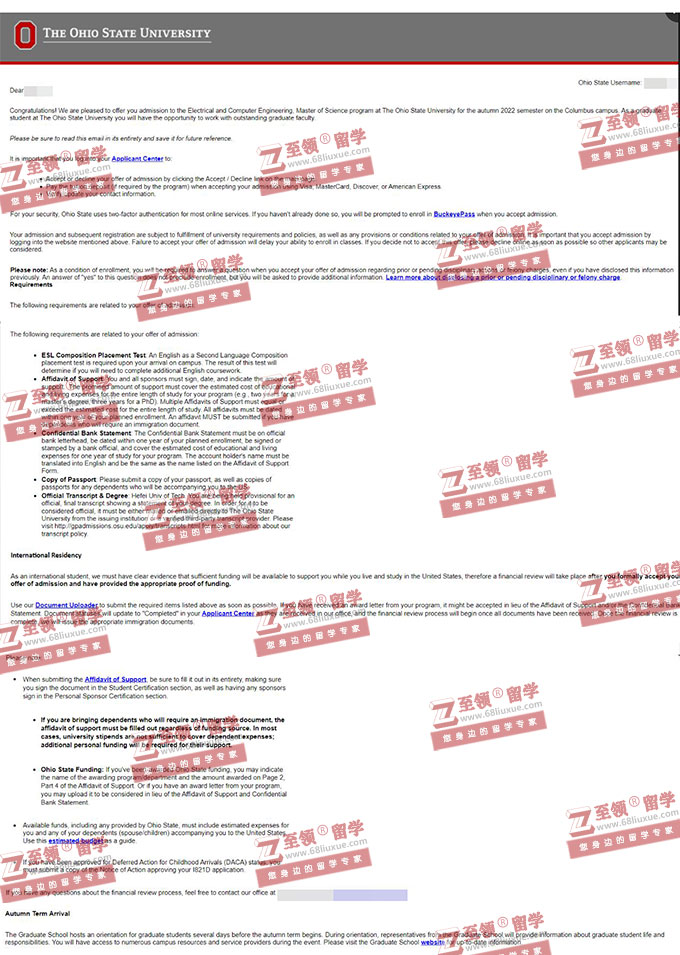 录取结果:Ohio State University,Master of Science in Electrical and Computer Engineering 俄亥俄州立大学电气与计算机工程硕士录取