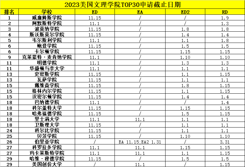 2023美本早申请已经进入倒计时!为了帮助同学们理清申请规划,更高效的准备申请材料,小编整理了最新的美国TOP50大学&TOP30文理学院ED/EA/RD等轮次的申请截止日期: