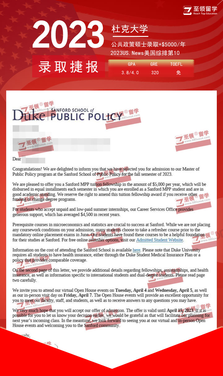 录取结果:Duke University,Master of Public Policy 杜克大学公共政策管理硕士录取+$5000/年