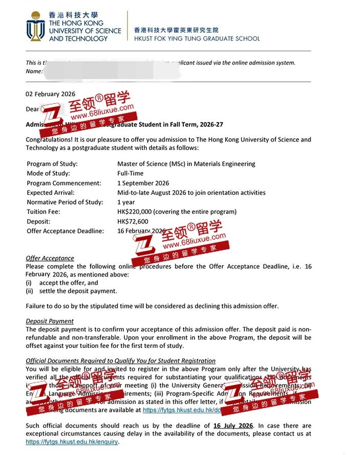 录取结果:香港科技大学材料学硕士录取