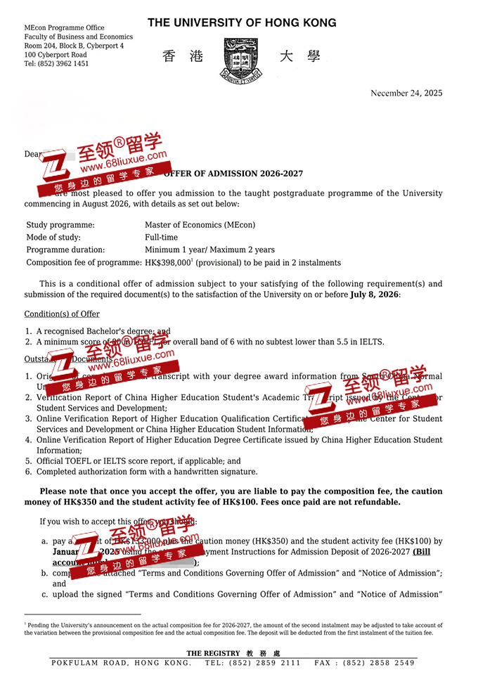 录取结果:香港大学经济学硕士录取