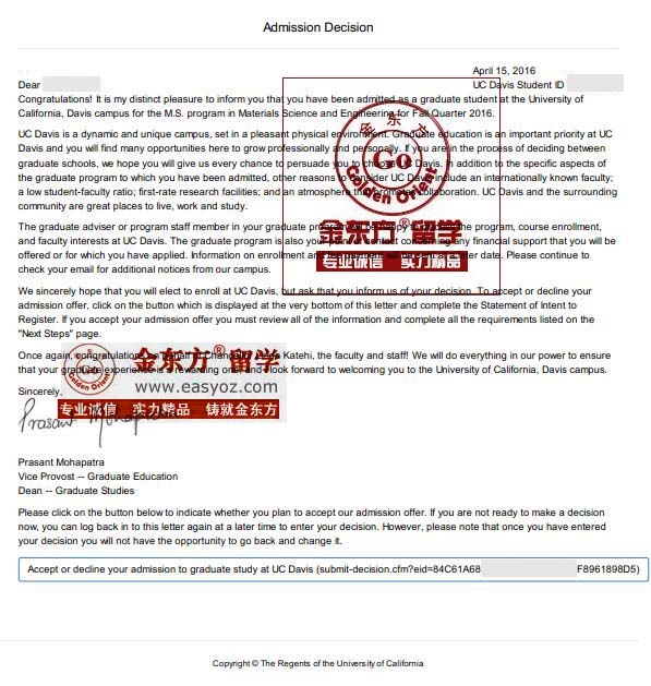 录取结果:UCD(加州大学戴维斯分校),MS in Materials Science and Engineering(材料科学与工程硕士)