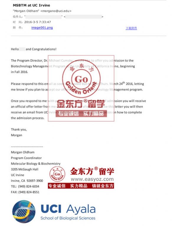 录取结果:University of California–Irvine(加州大学欧文分校), Masters Program in Biotechnology Management