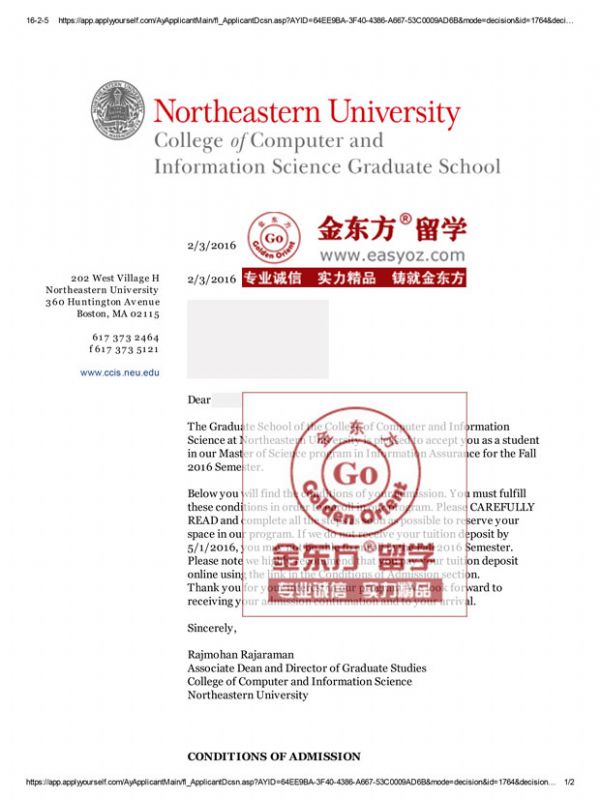 录取结果:东北大学,MS in Information Assurance