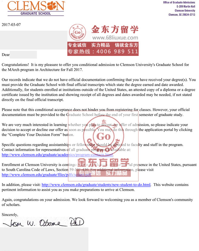 录取结果:Clemson University(克莱姆森大学),Master of Architecture (建筑学硕士)