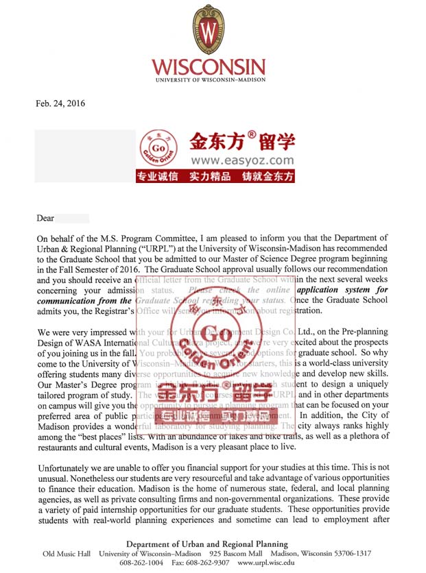 录取结果:威斯康星麦迪逊大学城市与区域规划专业硕士